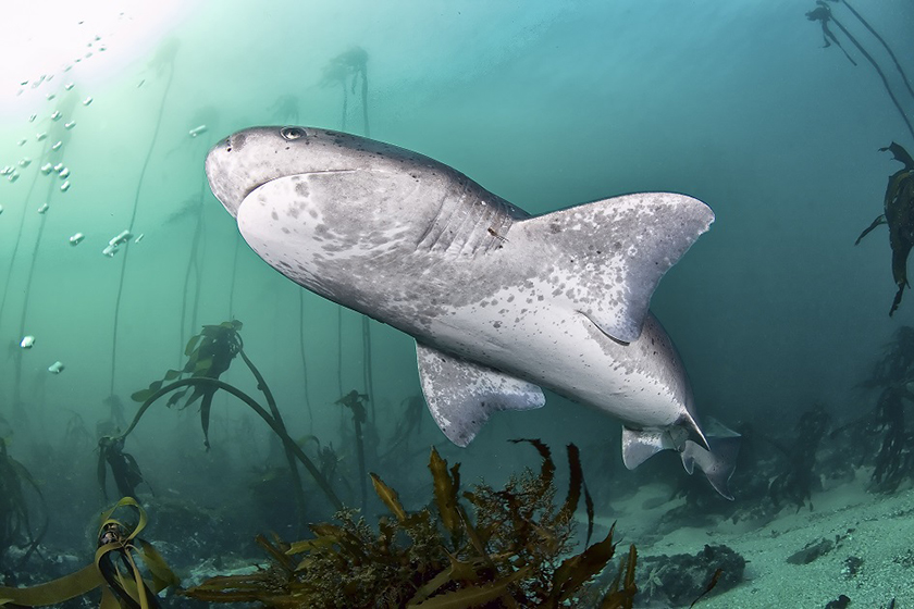 Introduction:A photo of the prehistoric Seven Gilled Cow Shark in a kelp forest in False Bay, Cape Town-South Africa.